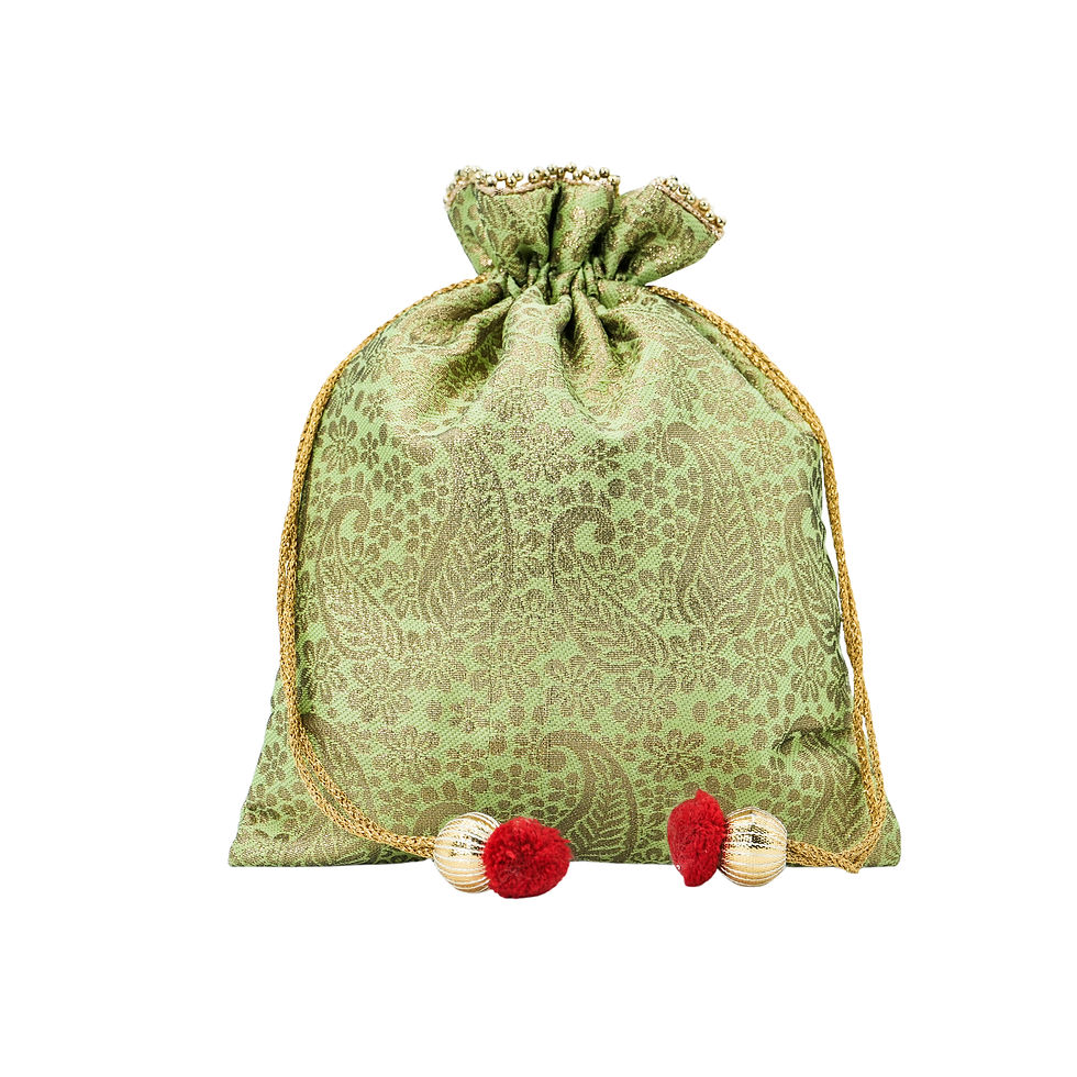 Radha Krishna Printed Green Potli Bag with Golden Lace and Red Fringe Weddings