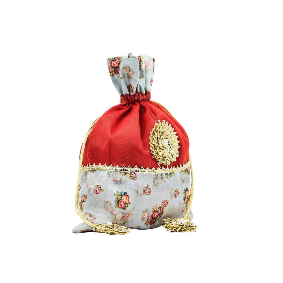 Floral Print Designer Potli Bag with Golden Flower Patch and Pearl Stylish Potli